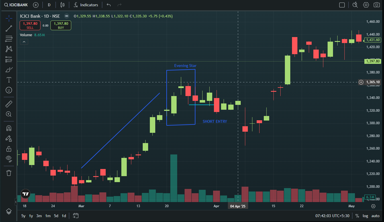 To trade the evening star, once it has formed after a significant uptrend, we can go for short trades. The entry can be done in 2 ways: either the trade can be taken at the break of the low of the third candle. Or, conservative traders can wait for the candle to close below the third candle low to take the entry.