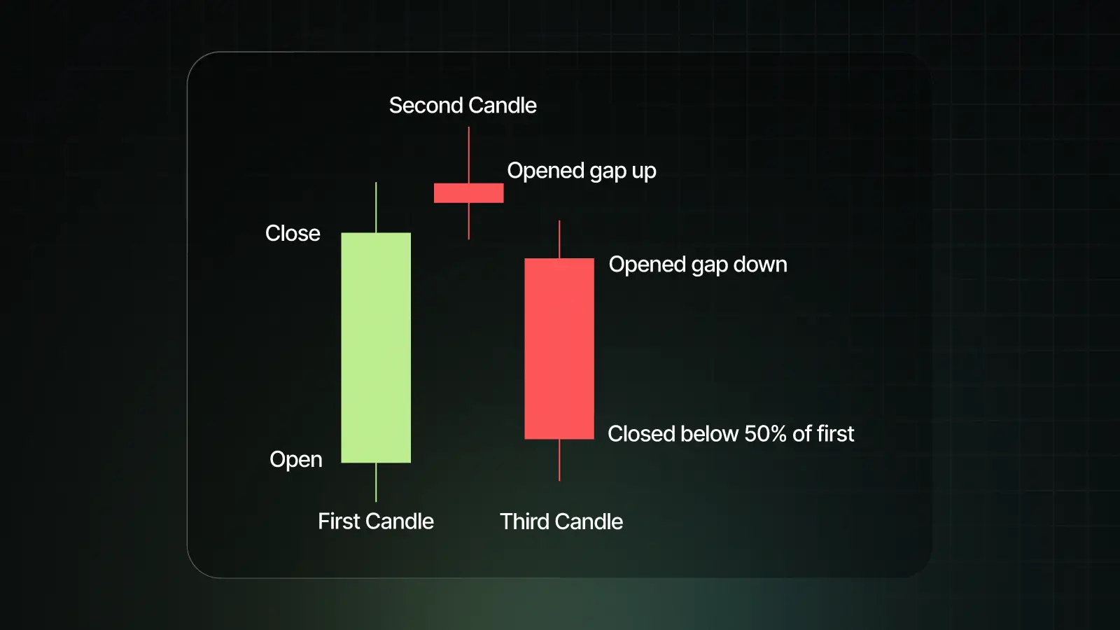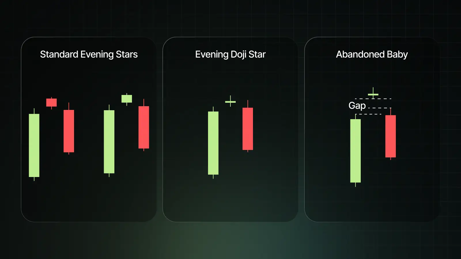 The Evening Star pattern is a 3-candle bearish reversal formation appearing after an uptrend.